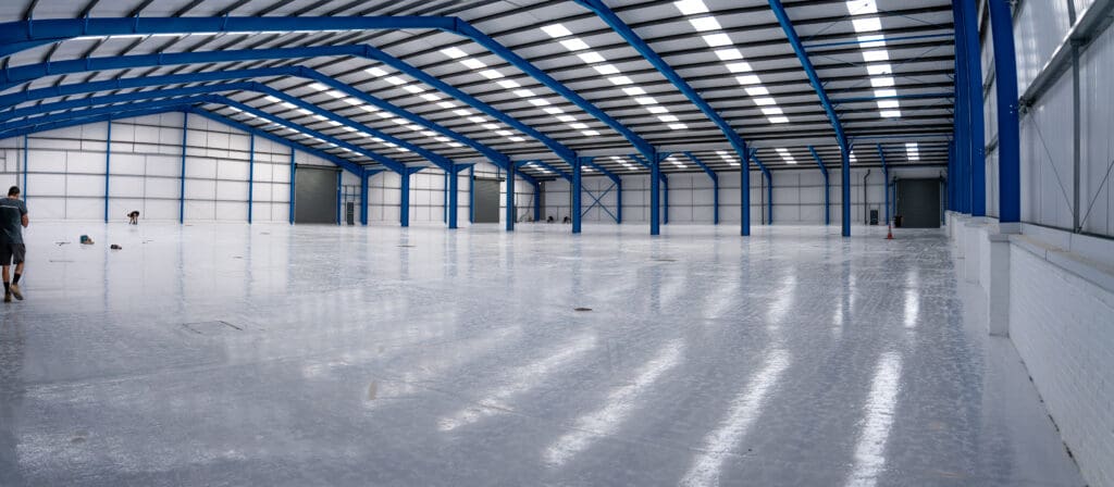 A 3,216m² EpoCoat HB Epoxy Coating installed in Platinum supplied by KDR Resin Systems for a roofing and cladding supplier and installer.
