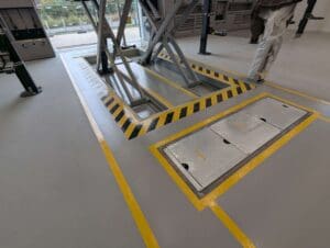 A 110m² Pumadur Polyurethane Coating installed in Grey supplied by RESDEV for a leading automotive brand. Additional health & safety line markings installed in yellow and black using a Pumatect V Epoxy coating.
