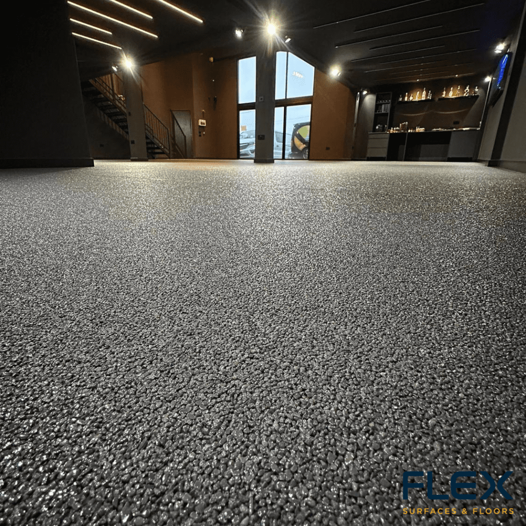 A blend of 1-3mm quartz and stone (coloured or natural) aggregate combined with a polyurethan or epoxy binding agent. Generally installed at a depth of 6-9mm and can be finished with a transparent pore filler and protective top coat.